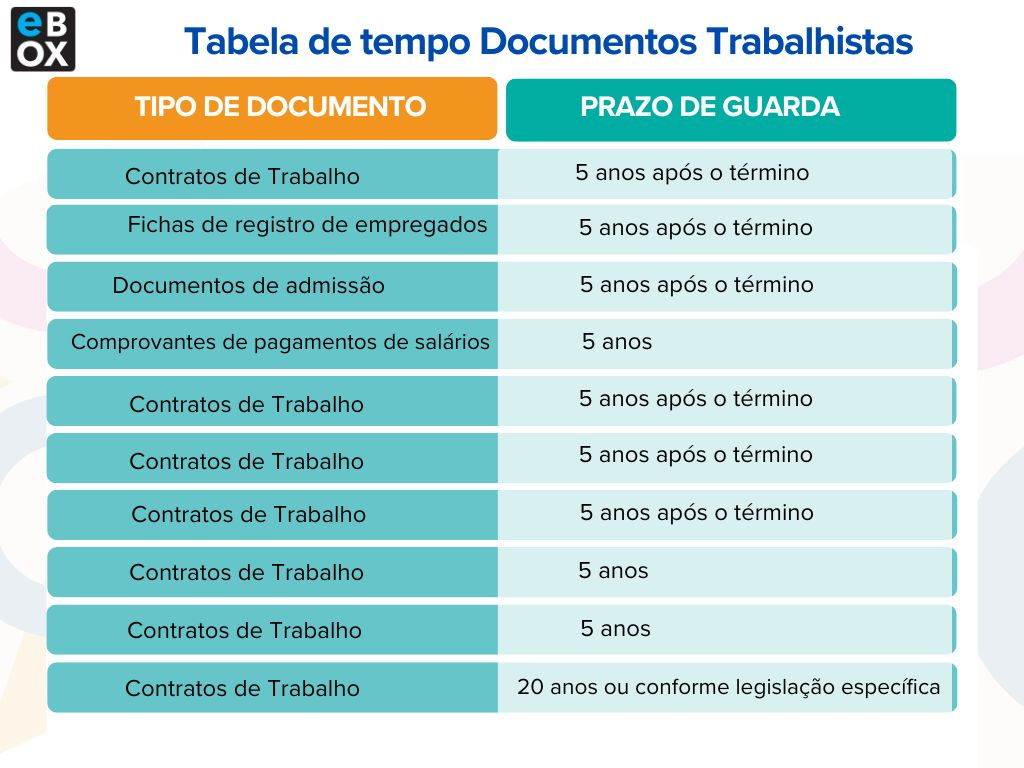 O prazo de armazenamento deve ser de 5 anos, já na tabela de tempo de guarda de documentos trabalhistas será preciso constar dois períodos diferentes, porque o registro eletrônico e a folha de pagamento precisam ficar guardados por 10 anos.